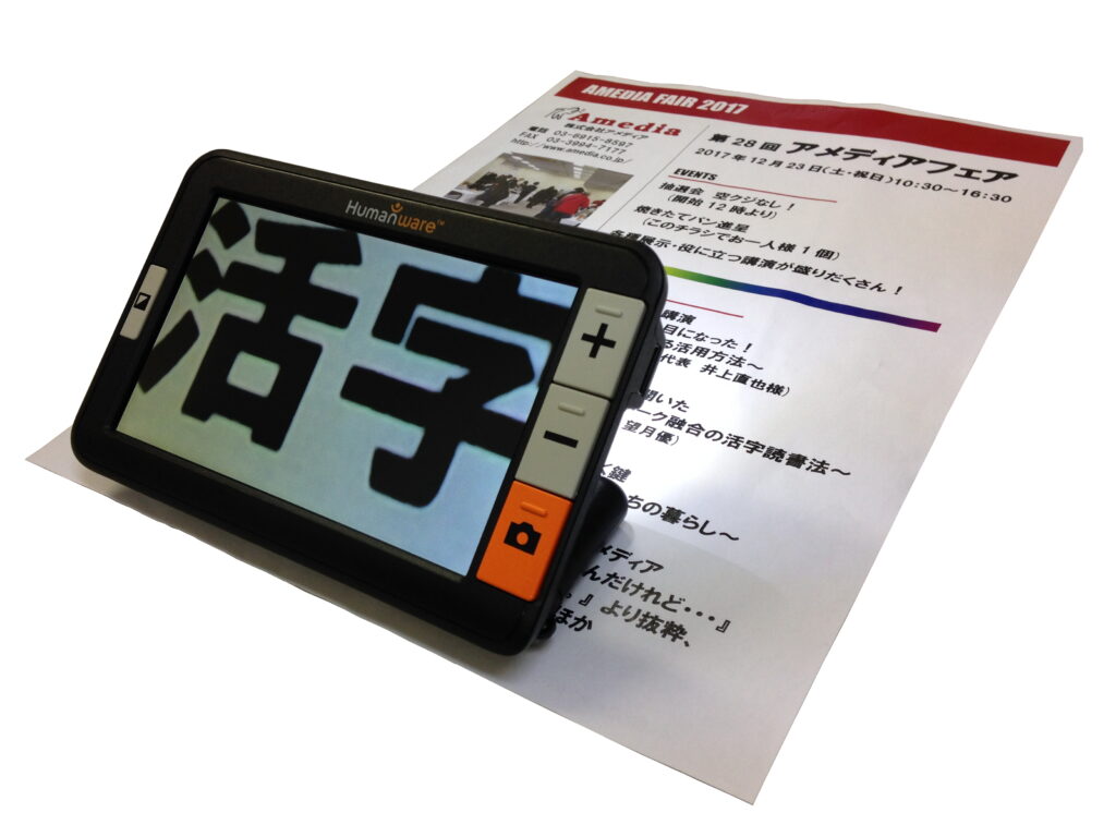 スタンドを横に開けばハンドルになるので片手で持てます。 - 画面上に横線やマスキングを表示させることができ、文字を目で追う時に便利です。