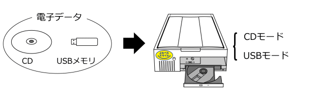 よむべえスマイルは、電源投入時には「音声読書機モード」または 「拡大読書機モード」のどちらかになっています。 CDやDVDやUSBメモリの内容をよむべえスマイルで聴く場合は、まず よむべえスマイルを「CDモード」または「USBモード」に切り換える必要があります。