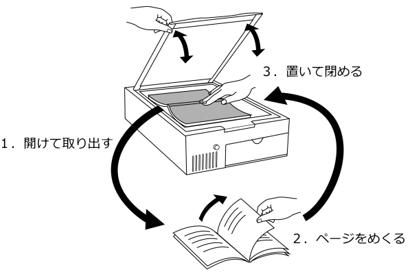 書籍などで、複数のページを一度にまとめて読み取りたい場合には 連続読み取りという機能を使うと便利です。 連続読み取りを開始すると、本機は指示があるまで 何度でも連続して読み取り動作を繰り返します。 このあいだに書籍のページをめくってタイミングよく本機に置くことで、 複数のページを一度に読み取ることができます。